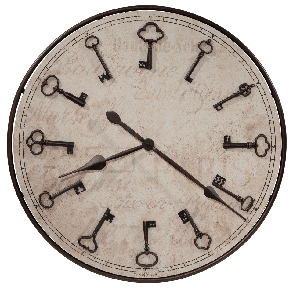 Applied vintage skeleton key hour markers and spade hands finished in oil rubbed bronze complement the frame