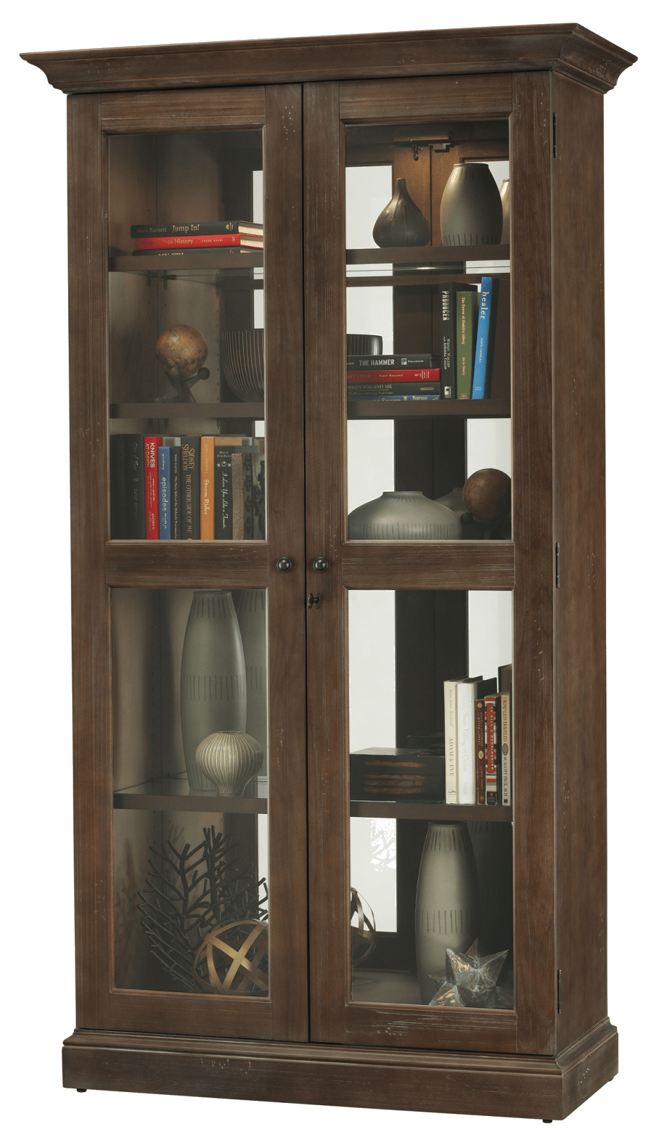 This cabinet features a flat pediment, solid side panels, and a plinth base. Locking, hinged front doors with iron finished knobs. Glass mirrored back enhances the view. Four extra thick glass shelves with a solid wood mullion provide for five levels of display with continuous holes for shelf adjustment.Read More