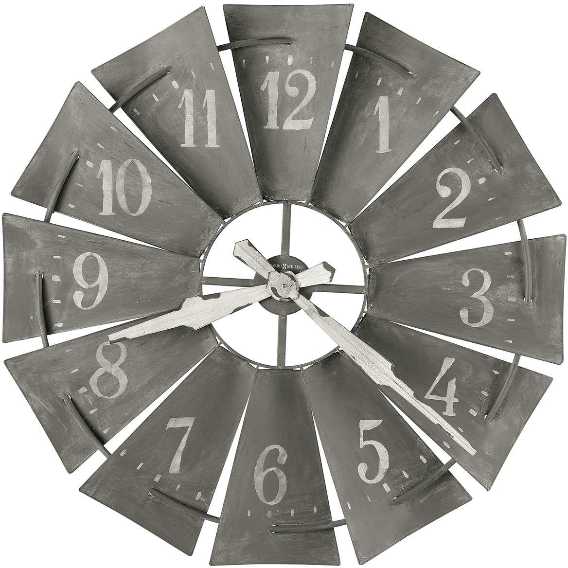 Aged white Arabic numerals and minute track decorate the fixed windmill blades.