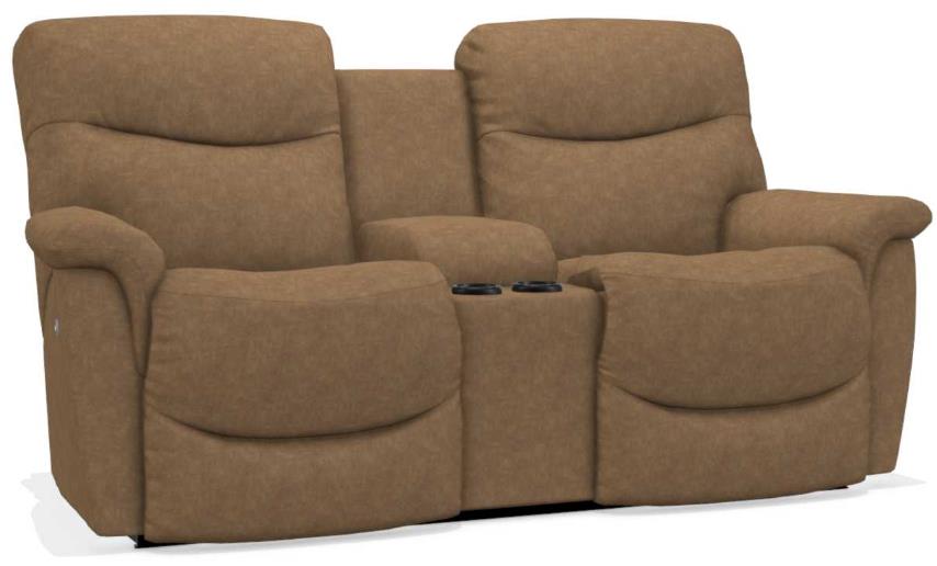 The James Power Reclining Loveseat with Headrest and Console has an inviting bucket-style seat and chaise leg rest that cradles you in support, while a stitched pillow back and pillow top arms pamper you in softness. Make it yours with your choice and fabrics and other available upgrades.