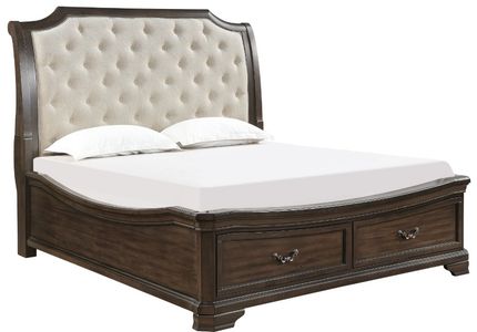 Sink into luxury against the sweeping sleigh-style headboard, upholstered in sumptuous 100% polyester, while the storage footboard optimizes space. Substantial moldings, bracket feet, and ornate hardware define the masterful style of this statement bedroom ensemble.Read More