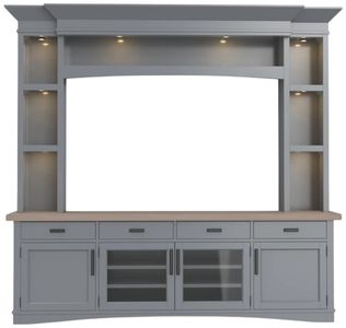 Surround your television and components in classic style with this 92-inch TV console with hutch. Simple yet elegant, its classic silhouette is finished in a dove gray with a contrasting wood-grain top in weathered natural.Read More