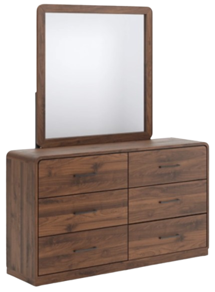 Grace your restful retreat with an added dose of refinement. This dresser with mirror showcases a stunning rich brown wood tone, with sleek drawer pulls for an added layer of luxury. A rounded top and mirror frame soften the silhouette, elevating the look. It’s curated, contemporary and utterly chic.Read More